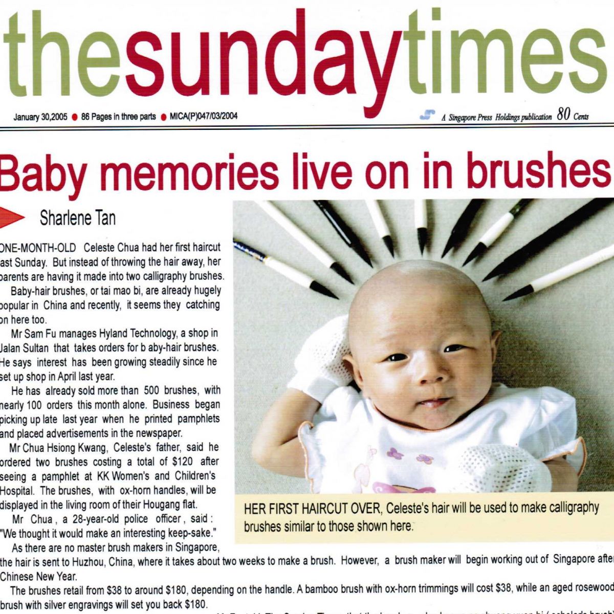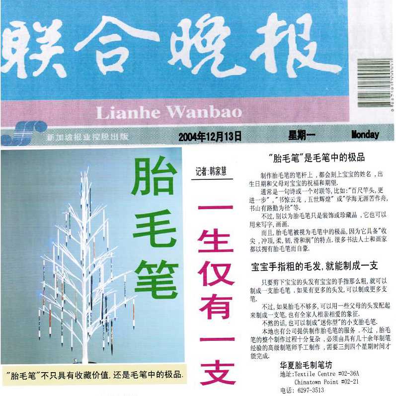 华夏胎毛笔始创于2003年,是新加坡唯一一间在本地制作胎毛笔的公司。短短数年间已经累积为70,000多名宝宝制作出95,000多支胎毛笔。从胎毛笔的选材,设计,制作,雕刻到成品,华夏胎毛笔均体现了让爱成形的理念。专业的设计团队,顶级手工师傅以及优秀的售前售后服务让华夏胎毛笔成为新加坡老字号品牌。