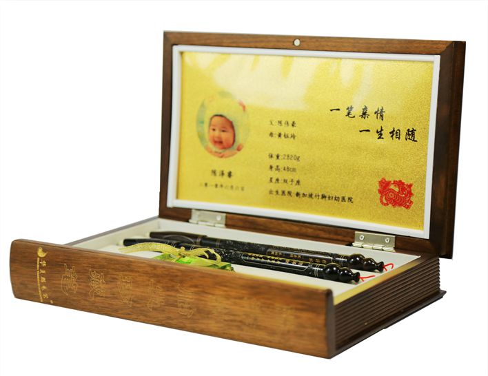 华夏胎毛笔主选百年檀木作为毛笔笔杆,用料精良,并根据每个宝宝特点,挑选紫檀、黑檀和红檀等不同原木,以搭配宝宝五行八字,每支胎毛笔结合了主人的灵气,与主人融为一体。